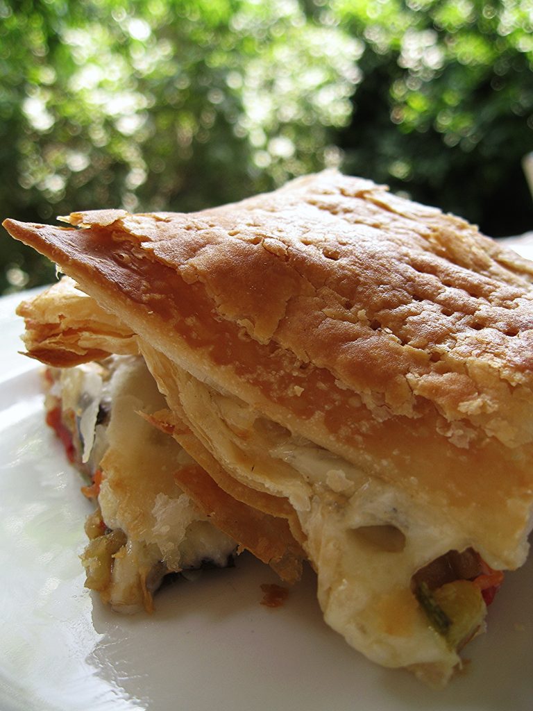 - Sfornate le placche con le sfoglie e, senza farle raffreddare, copritene una con le verdure ancora calde, la mozzarella (che così tenderà a sciogliersi) e le fettine di pomodoro alternate in due strati. Coprite con il secondo rettangolo di sfoglia, tagliate il tutto a trancetti e servite subito.