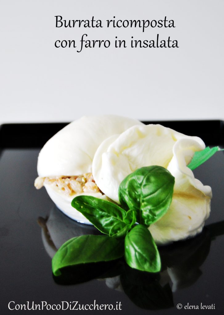 Un’altra ricetta con la burrata me la concedete? Solo un’altra vi prego! Questa burrata ricomposta, ripiena di un’insalata fredda di farro, olive e acciughe non posso proprio non condividerla con voi!