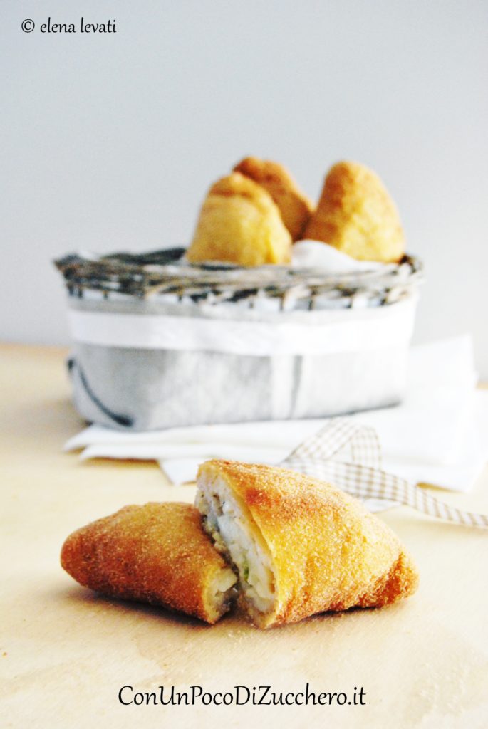 - Roll out the pastry into a thin disk and cut 6 circles with a large cutter. Fill each circle with the mixture for stuffing, brush the edges with some milk and close it. Put your snacks firts in the flour, then in the eggs and finally in breadcrumbs. repeat this operation another time.