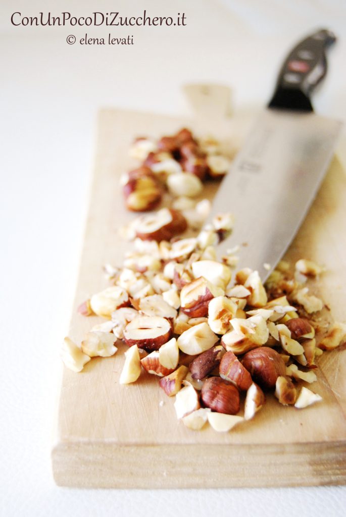 Put hazelnuts in a hot frying pan and toast them for 5-6 minutes on medium flame. Pass them hot in a kitchen cloth removing the skins, then coarsely chop them with a knife and keep aside.