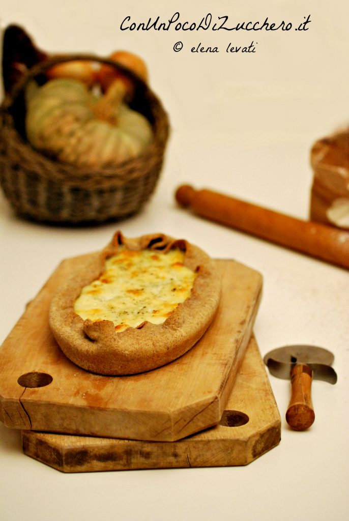 - For the stuffing: 600 g pumpkin (weight without seeds but with the peel), 60 g ricotta cheese, 3 leeks, 1/2 cup white wine, 1 small egg, 200 g mozzarella fior di latte (for me Caseificio Pugliese), salt, pepper, nutmeg.