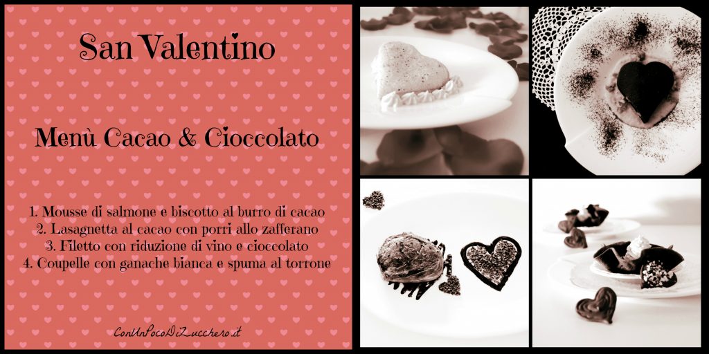 Sono 5 menu molto interessanti, c’è davvero l’imbarazzo della scelta. Ma da amante del cioccolato (eh, sì, pure quello è amore :-D), mi butterei su quello cacao & cioccolato (che è pure afrodisiaco, no? :-D)