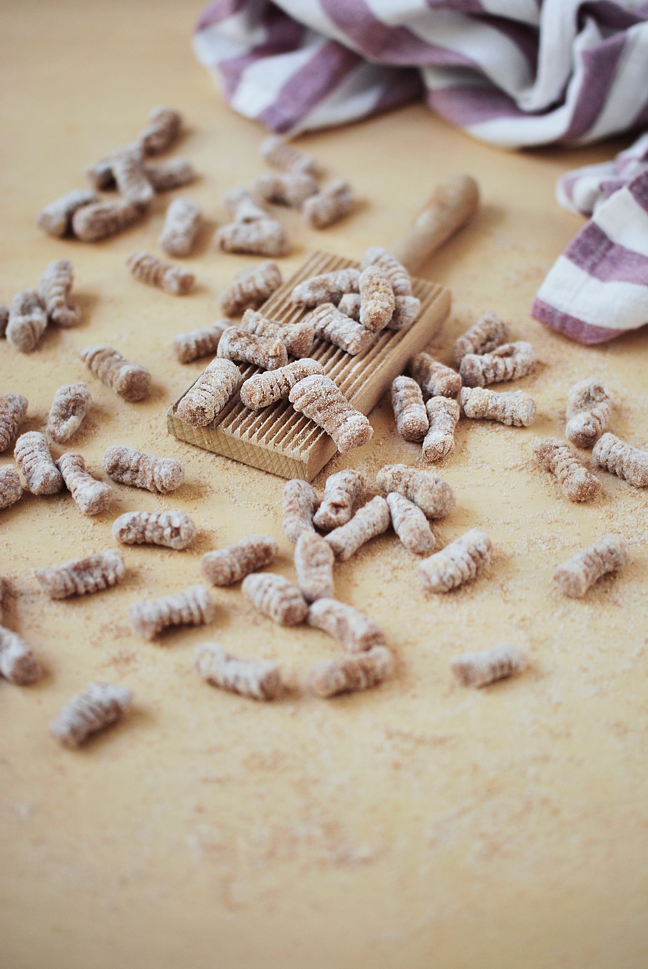 - Per i gnocchetti: 200 gr acqua, 160 gr semolino di farro (per me Molini Spigadoro), sale, pepe, noce moscata, scorza di mezzo limone grattugiata, farina 1 per spolverare.