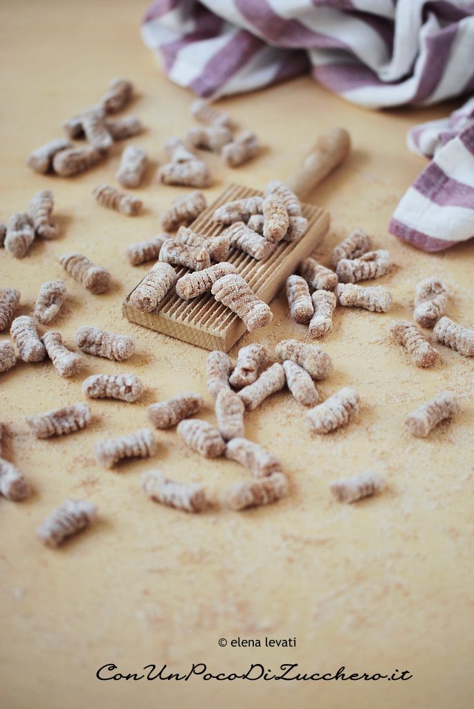 - Riprendete l’impasto dei gnocchetti e dividetelo in 8 parti. Spolverate il piano da lavoro con un po’ di farina e formate con ogni parte un filoncino lungo e stretto. Tagliate ogni filoncino a tocchetti regolari e passate ogni tocchetto sul riga gnocchi o sui rebbi di una forchetta per dare forma ai gnocchetti (potete anche rotolare ogni tocchetto a pallina ottenendo le chicche).