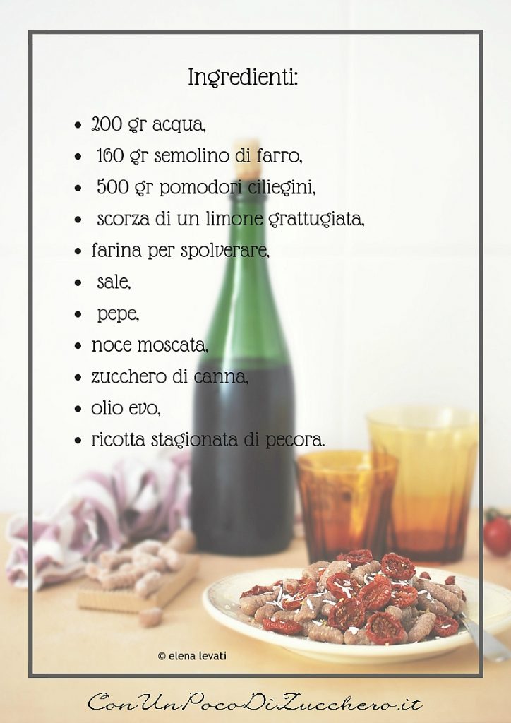 Gli ultimi pomodorini di stagione li facciamo confit e li usiamo per condire un piatto di gnocchetti all’acqua , senza uova, dai toni autunnali perchè preparati solo con farina di farro.
