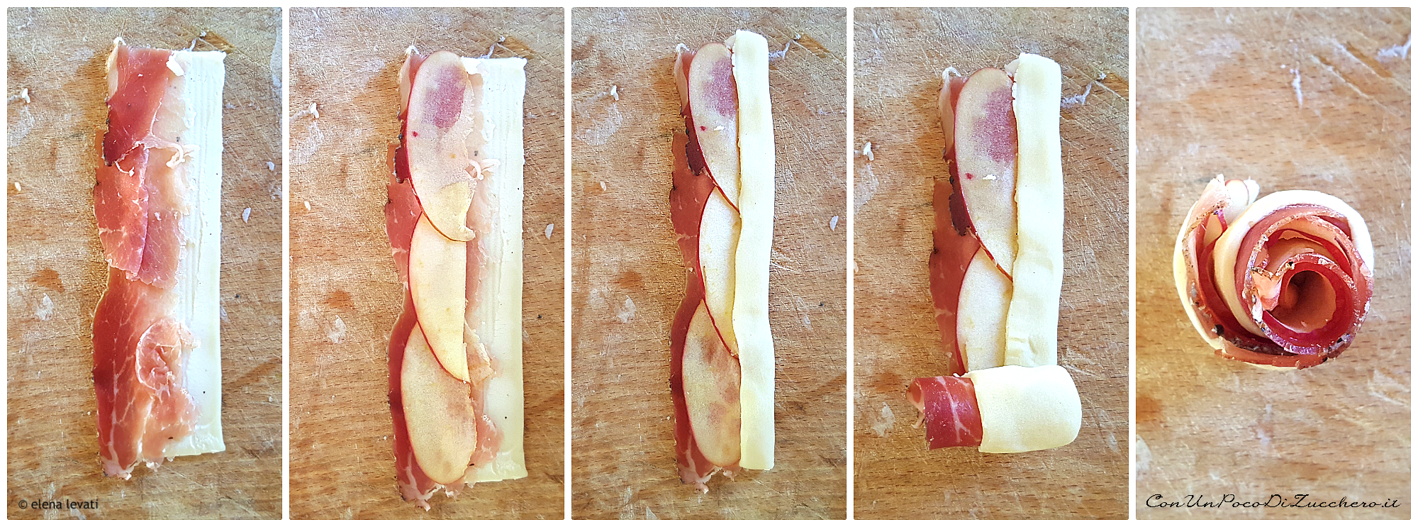 Ognuna di esse è formata da una striscia di pasta sfoglia, spalmata con un leggero strato di robiola (ma va benissimo anche una ricotta, un tomino fresco o un caprino), coperta con speck e fettine di mela e, quindi, arrotolata su se stessa. Ogni rosellina viene poi messa vicina alla successiva direttamente sulla leccarda andando a formare il nostro albero di Natale.