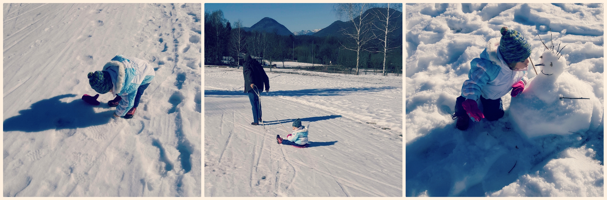 E così abbiamo inseguito l’ultimo spizzichino di neve rimasto miracolosamente in qualche prato ombroso al di là del sole caldo che tutto intorno aveva già fatto piazza pulita. Sembrava fosse lì per lei, solo per lei quel pratone: con quelle due discesine lievi perfette per la sua prima scivolata sulla neve, con quella pista leggermente battuta perfetta per farsi trainare dal nonno, con quella zona di ombra più fredda in cui aspettava solo le sue manine quella montagnetta di neve pronta a divenire un piccolo simpatico pupazzetto.