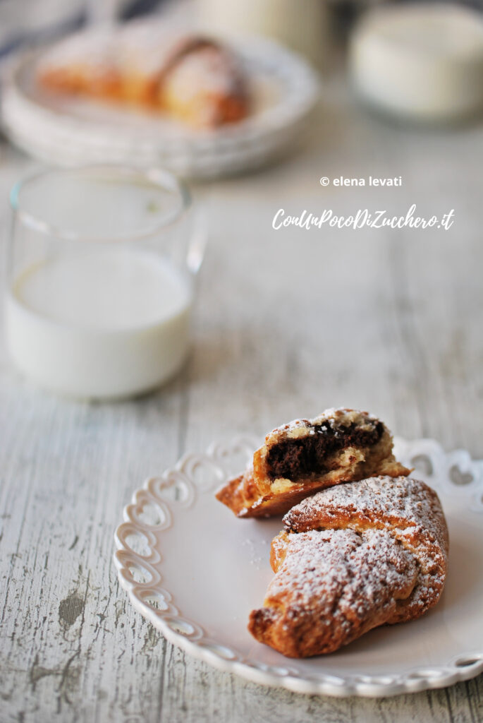 Non vi fate imbrogliare dal primo sguardo: questi piccoli croissants sono tali solo nella forma, mentre nell’anima sono dei semplicissimi biscotti di pasta frolla ingolositi da un super ripieno di nutella (o altra crema spalmabile alle nocciole) e cioccolato!