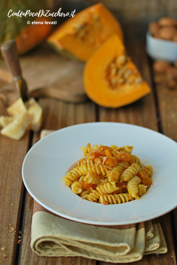 Pasta con zucca e amaretti: un primo piatto semplicissimo e veloce da preparare, che tuttavia sa regalare al palato un piacere immenso! La dolcezza della zucca e dello scalogno, messi a crudo in padella senza soffritto, si sposa perfettamente con il gusto tipico e insostituibile degli amaretti, creando un boccone succulento e gustoso nella sua delicatezza! D’altronde non è un segreto la bontà dei tortelli di zucca mantovani dove, appunto, il nostro ortaggio si incontra felicemente con gli amaretti!